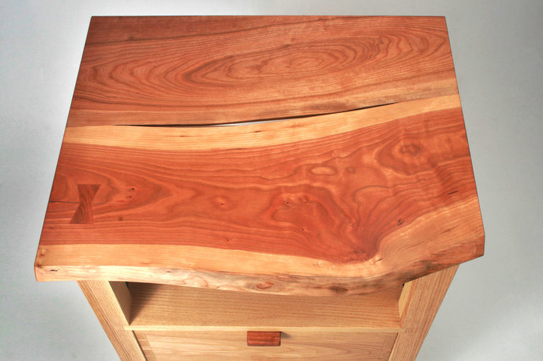 This nightstand was built with locally harvested ash and naturally curved cherry. It features two hand-cut dovetail drawers with all wooden hardware, curved and splayed legs, and a top shelf for those easy to reach bedside items. The top features curved live edge cherry boards joined on the curved edge for an organic form. Built as part of a live edge curved cherry bedroom set.