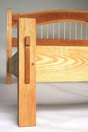 This bed features two notable and unique design elements: The beautiful naturally curved live edge cherry slab headboard and that no metal hardware is used in the construction of the rame. It instead uses an exposed through-dovetail joint held tight with hardwood wedges at each bed post. Incredibly solid, elegant and visually striking, this joint is also fully removable creating a bed that completely knocks apart for flat pack moving.